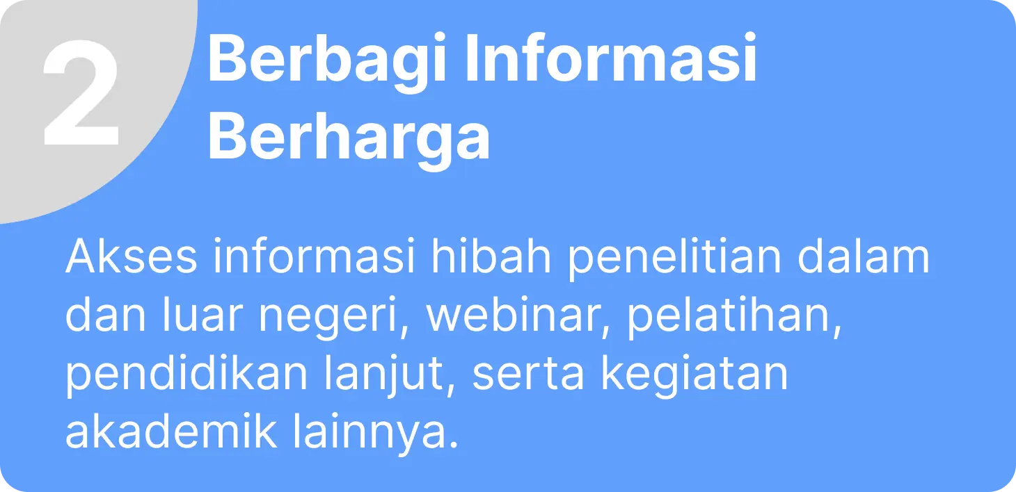 Memfasilitasi pertukaran informasi tentang hibah penelitian, beasiswa, webinar, dan short course dalam & luar negeri.