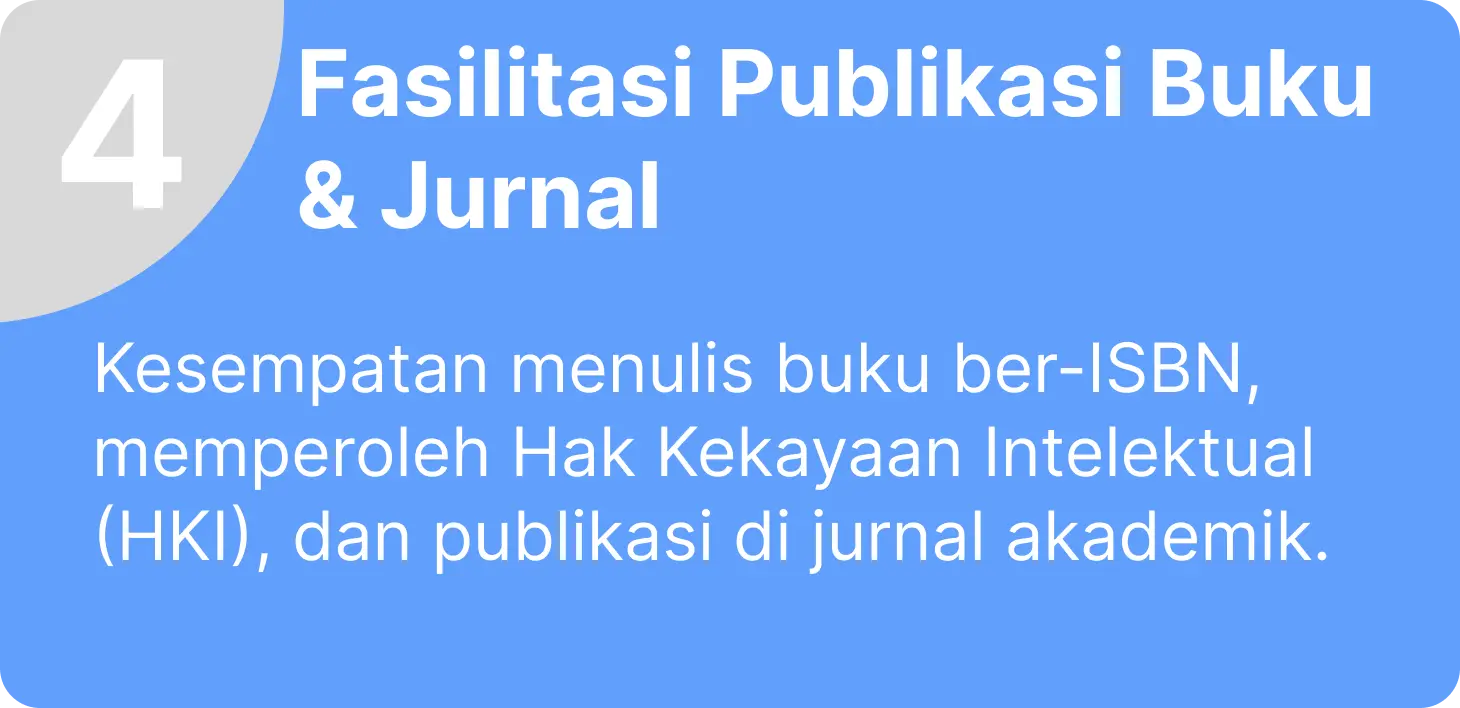Memfasilitasi penulisan buku ber-ISBN dan jurnal ilmiah sebagai kontribusi dalam pengembangan ilmu pengetahuan.